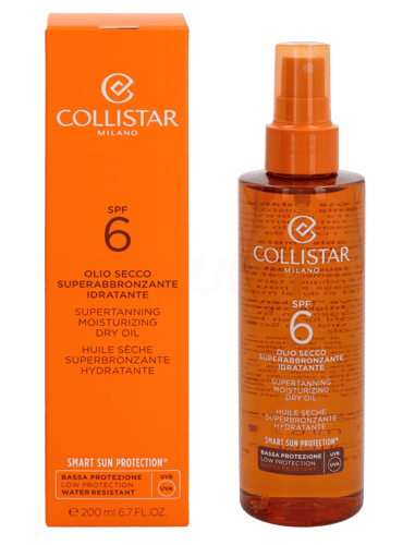 Collistar Supertanning Moisturising Dry Oil SPF6 200ml Speciale Abbronzatura Perfetta - Low Protection är för daglig användning och kan användas på alla hudtyper. Den är särskilt bra för torr och skadad hud. Oljan återfuktar och håller huden mjuk, frisk och välnärd. Den har en mjukgörande och utjämnande effekt på huden. Massera in oljan på torr eller fuktig hud tills den absorberats.