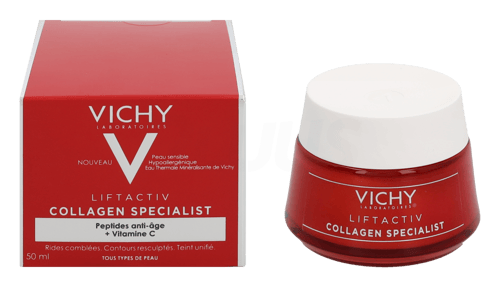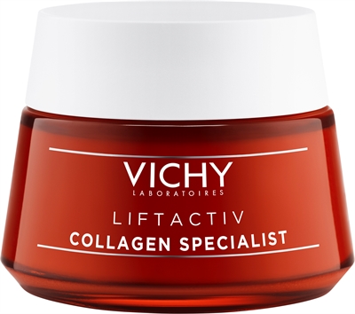 Vichy Liftactiv Collagen Specialist Day Cream är en innovativ fuktkräm som hjälper till att förbättra kollagenproduktionen, en naturlig proteinfiber som minskar med åldern och leder till ålderstecken. Liftactiv Collagen Specialist, avancerad anti-ageing ansiktskräm för dag- och nattbruk. Krämen ger omedelbara och ackumulerade resultat och är lämplig för känslig hud. Formulerad med peptider och vitamin Cg för effektiva resultat redan efter första appliceringen. Resultaten förbättras gradvis med bevisad effekt efter 2-8 veckor.