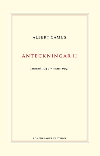 Hela sitt vuxna liv använde Albert Camus anteckningsboken som övningsplats för tankar, känslor och litterära projekt. Hans samlade anteckningar utgörs av idéer och möten, korta anekdoter och längre utkast om vartannat, men med konstant pregnans och precision.I Anteckningar 2 tas läsaren genom bland annat andra världskrigets slut, kalla krigets början och tillkomsten av Pesten och De rättfärdiga. Jan Stolpe har till denna utgåva reviderat Anders Bodegårds tidigare översättning mot nya kritiska utgåvor av den franska texten samt kompletterat den med två längre resedagböcker till USA och Sydamerika. Han har även skrivit noterna.