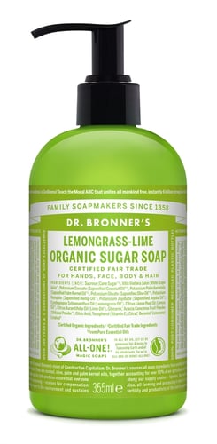 Fantastisk ekologisk tvål från Dr Bronner som är bra för både kropp och planet! Den flytande tvålen från Dr Bronner är 4-i-1 och kan användas för att tvätta händer, hår, ansikte och kropp. Tvålen blandar ekologiskt fairtrade-socker med ekologisk vit druvjuice för att hålla huden återfuktad och mjuk. Sockret fungerar också som en naturlig exfoliant. Dessutom innehåller tvålen shikakai-pulver, som har ett lågt pH-värde, samt ekologisk kokos-, hampa- och olivolja. Tvålen är berikad med en härlig och fräsch doft av citrongräs och lime. Användning:4-i-1 tvålen kan användas för att tvätta händer, hår, ansikte och kroppVid hårtvätt, fördela tvålen i håret tills det skummar innan du sköljer urFördelar:4-i-1 ekologisk tvålLemongrass och lime doftInnehåller rättvisemärkt sockerVeganInte testad på djur