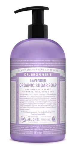 Vegan och ekologisk sockertvål i pumpflaska. Lavendel. Våra 4-i-1 ekologiska pumptvålar är bra för att tvätta händer, ansikte, kropp och hår. Söt för kroppen och planeten! Rättvisemärkt och ekologiskt rörsocker ger våra Organic Pump Soaps en rik karamellfärg och söt doft. Sockret kombineras med ekologisk vit druvjuice för att hålla din hud närd, återfuktad och smidig och är en naturlig exfoliator. Ekologiskt shikakai-pulver med lågt pH används traditionellt för hårvård i Indien och är skonsamt mot hårbotten och håret. Organiska kokosnöt-oliv- och hampoljor blandas för ett krämigt castilleskum och vår tvåltillverkningstradition! Användning: 4-i-1 organiska pumptvålar är bra för att tvätta händer, ansikte, kropp och hår och placera vid diskbänken eller i duschen! Det ekologiska shikakai-pulvret och det ekologiska sockret i denna tvål gör den lämplig för att tvätta håret. Tips! När den används som hårtvätt: Efter tvätten, följ upp med en lätt sur, vårdande sköljning. Det återställer hårets naturliga pH-värde och lämnar håret silkeslent. Fördelar:SugertvålLavendelsdoftFör händer, ansikte, kropp och hårOrganisk