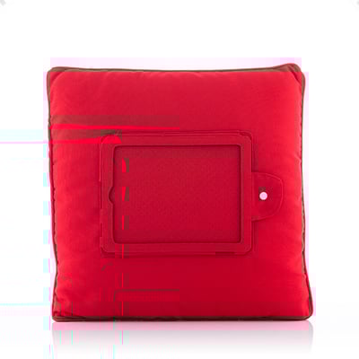 Denna kudde från har ett insytt fodral för en iPad eller E-Book med måtten 23 x 18,5 cm. Med kudden kan du hålla din iPad utan smärta i handlederna. Den är perfekt när du reser med buss, bil, tåg eller flyg.