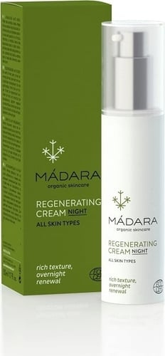 Madara Regenerating Night Cream 50ml är utformad för att bygga upp huden efter dagens svårigheter. Genom att applicera nattkrämen med ingredienser som tar hänsyn till den återuppbyggnad som sker kommer huden snabbare att återställa sin vitalitet. Genom att applicera en nattkräm i samma serie som dagkrämen får huden ny tillförsel av aktiva ingredienser och effekten förstärks.