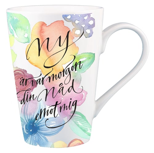 • Vacker te- och kaffemugg i klassiskt snitt med psalmtolkning av illustratör Charlotta Folkelind. Fint, greppvänligt öra och texten "Ny är var morgon din nåd emot mig" ur Stor är din trofasthet av Thomas Chisholm. Blommönster i akvarell runt om muggen. Högkvalitativt glaserat tryck på vitt porslin. Muggen är 12 cm hög och rymmer ca 3,5 dl.