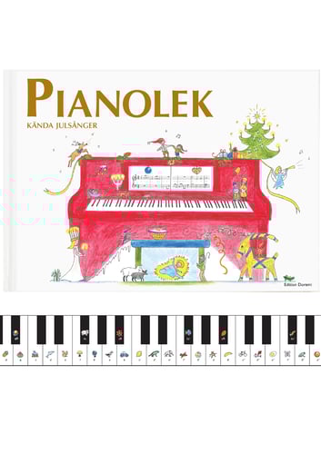 • Ingen jul utan musik! Drömmer du om att få spela julens kända sånger, så hjälper dig Pianoleks julbok att komma igång på ett enkelt och roligt sätt. Noterna har bytts ut mot skojiga figurer: t.ex. flygmaskin, elefant och citron. Julboken kan användas från femårsålderen, hemma och i musikskolan. I svårighetsgrad och stil motsvarar julboken både bok 1 och bok 2 i pianolekserien, och fungerar på så sätt som ett komplement till de tidigare böckerna. Med boken följer en tangentremsa som passar till piano och keyboards med normal tangentstorlek.Spela julens sånger på piano och keyboard med hjälp av flygmaskin, elefant och citronBehovet för en alternativ väg in i musiken är katalysatorn för skapelsen av Pianolekserien. Helt enkelt har de traditionella noterna bytts ut mot en hel värld med skojiga figurer i många färger. Figurerna gör det roligt och lätt för barn och deras föräldrar att lära sig spela piano eller keyboard. Det krävs inga särskilda musikaliska förutsättningar, alla kan vara med! Kända julsånger som motivationsfaktorEtt annat musikpedagogiskt knep är bokens 24 kända julsånger. De flesta som försöker lära sig spela ett instrument blir motiverade av melodier de känner igen: “Åh ja - den är bra! Den vill jag spela!”. När barnet öppnar boken känner det igen sig, vilket är värdefullt i inlärningsprocessen. Musikaliska uppgifter som lär dig noterMålet med julbokens musikaliska uppgifter är att bygga en bro mellan figurer och traditionella, svarta noter. Tack vare figurerna kan du komma igång snabbare med att spela julsångerna, samtidigt som du utvecklas fortare, både motoriskt och musikaliskt. Men på längre sikt är det en bra idé att du lär dig de svarta noterna. Innehåll julsånger Goder aftonLusse lelleNu tändas tusen juleljusSockerbagarenNär juldagsmorgon glimmarJingle Bells / BjällerklangNu är det jul igenLucia / Så mörk är nattenJul, jul, strålande julTre pepparkaksgubbarNej, se det snöarVi tänder ett ljus i adventHärlig är jordenTomtarnas julnattEtt barn är fött på denna dagNu ha vi ljus här i vårt husStilla nattSankta LuciaWe Wish You A Merry ChristmasHej, tomtegubbarDeck The HallsRudolf med röda mulenDing, Dong! Merrily On HighAdventstidMössens julaftonHej, mitt vinterland Musikaliska uppgifter Vilka passar ihop?Rytm / Gå till konditorietRita svarta noterGissa två sångerRytm / Gå på tomtecirkusVilka passar ihop?Rita svarta noterGissa två sångerVilka passar ihop?Rytm / Gå på tomtecirkusRita svarta noterGissa två sångerRita svarta noterRytm / Gå till konditorietSpela efter noter / Goder aftonSpela efter noter / Jingle BellsSpela efter noter / Nu tändas tusen juleljusSpela efter noter / Nu är det jul igen Pianolek - nästa steg Är du redo för bok 2? / Broder JakobÄr du redo för bok 2? / Små grodornaÄr du redo för bok 3? / Prästens lilla kråka? Alfabetiskt register