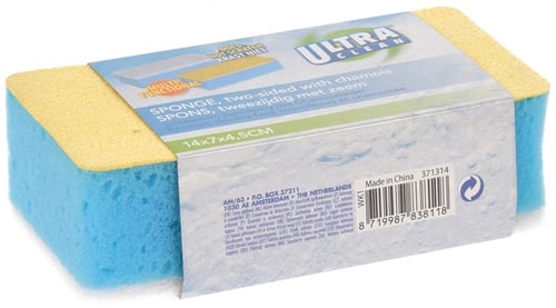 Med vit skrubbande del, medan den gula sidan är skonsam mikrofiber.