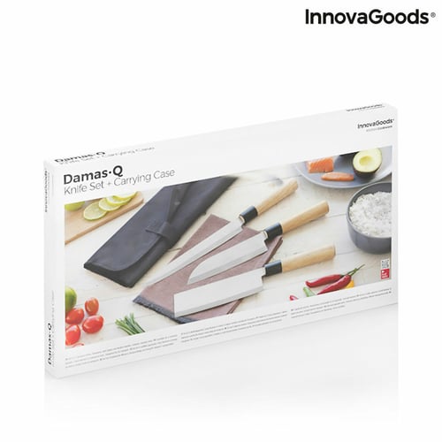 Ett komplett set med högkvalitativa japanska knivar med professionell väska och Damaskus-knivblad med din egen design (laseretsat). Settet innehåller 3 sorters knivar: filékniv (för fisk), hackkniv (för grönsaker julienne) och santokukniv (för hackade grönsaker, kött eller fisk). Idealisk som present och ett värdigt tillskott till de mest kräsna kök och de bästa kockarna.